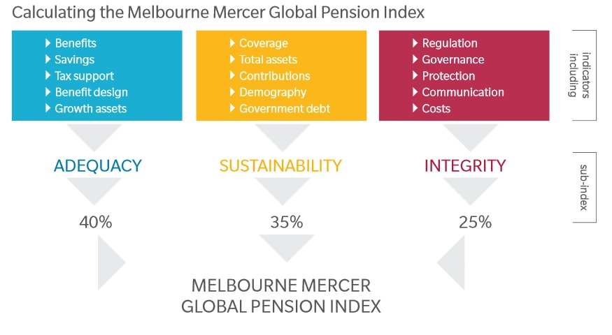 You can download and read the 2015 Melbourne Mercer Global Pension Index report here. The overall index value for each country’s pension system represents the weighted average of the three sub-indices below (click on image):