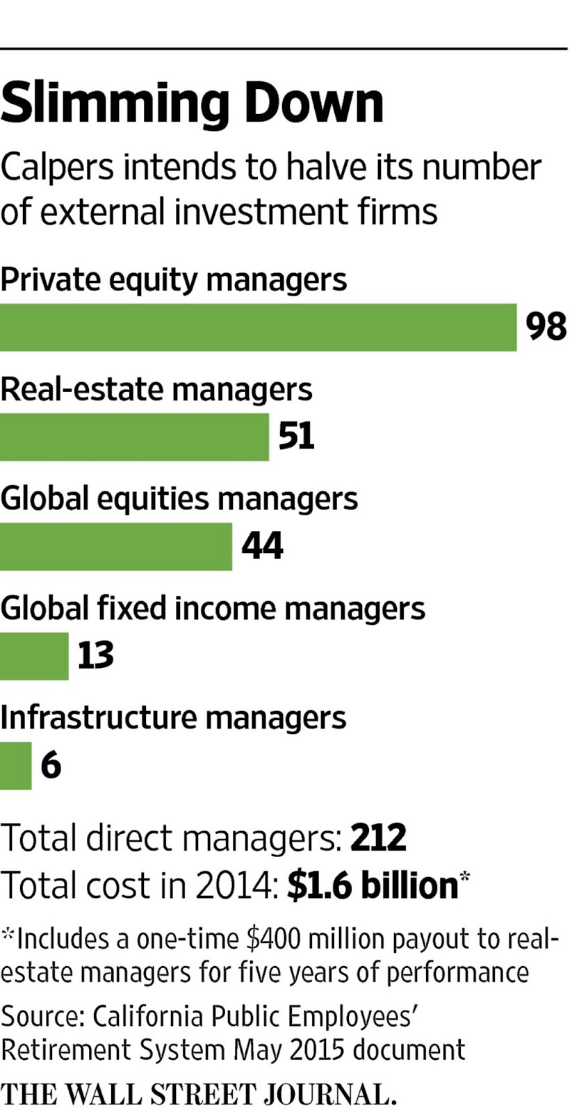 As recently as 2007, Calpers had about 300 external managers—a remnant of its pioneering foray into alternative investments such as real estate, hedge funds and private equity. Over the past eight years, it reduced that number to 212, but it is still difficult for the pension fund to effectively monitor all of its investments, according to Mr. Eliopoulos.