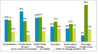 Investment concerns also vary according to the institution type. Globally, sovereign wealth funds (46 percent), public sector pensions (31 percent), insurance companies (25 percent), and endowments and foundations (22 percent) are most worried about market volatility. However, a low-return environment is the top concern for private sector pensions (38 percent). (click on image)