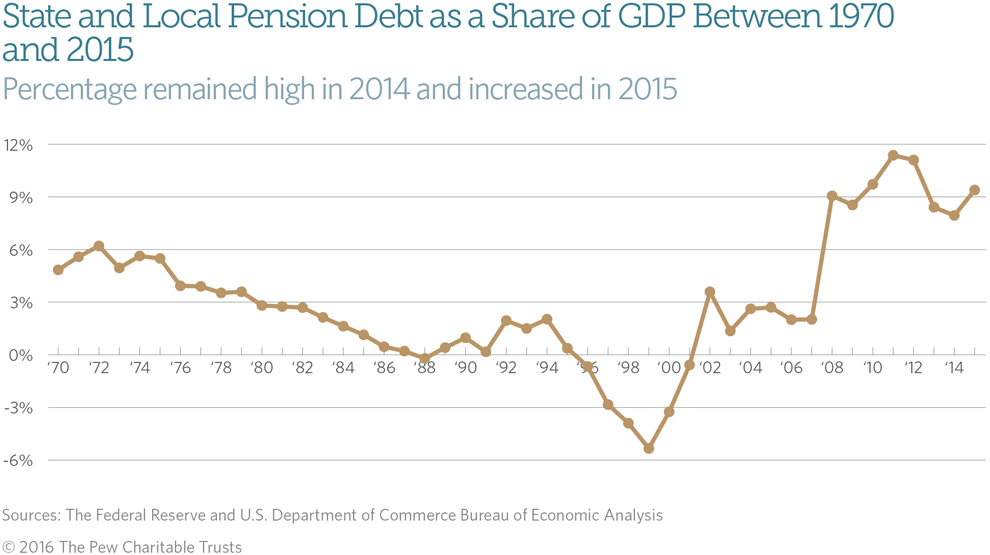 When combined with the shortfalls in local pension systems, this estimate reaches more than $1.5 trillion for fiscal 2015 and will likely remain close to historically high levels as a percentage of U.S. gross domestic product (GDP). The lesson here is that state and local policymakers cannot count solely on investment returns to close the pension funding gap over the long term; they also need to follow funding policies that put them on track to pay down pension debt.