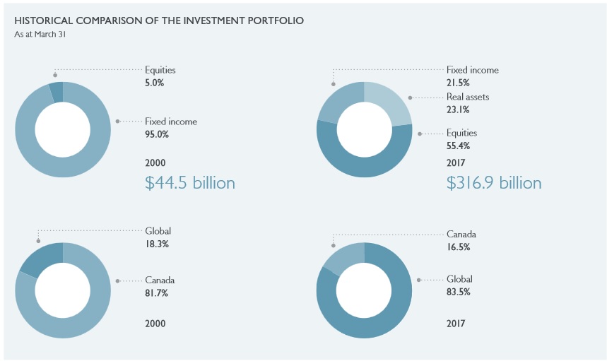 At the very beginning back in 2000, CPPIB’s portfolio was almost all Canadian bonds and a tiny bit in Canadian equities and now it’s made up of roughly 22% fixed income, 23% real assets, and the rest of it mostly in US and international public and private equities.