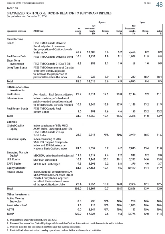 As such, in my analysis below, I will be referring to parts of the Caisse’s 2014 Annual Report which you should all take the time to read here. It’s important to understand that a proper analysis of any pension fund’s results requires a proper understanding of benchmarks used to gauge the risks used to add value over those benchmarks.