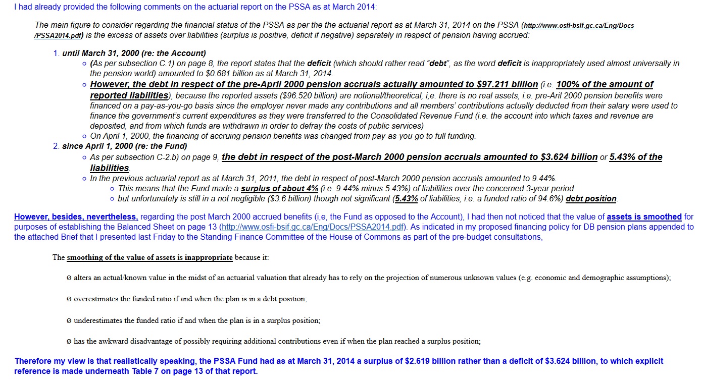 I asked Bernard Dussault, Canada’s former Chief Actuary, to provide me with his thoughts on the latest report on the PSSA as of March 2014 (click on image below to read his email response):