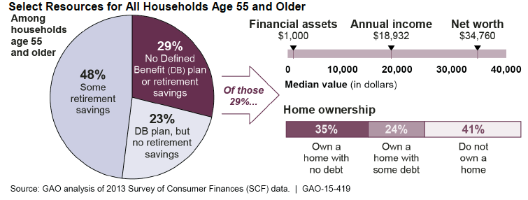 A new GAO analysis finds that among households with members aged 55 or older, nearly 29 percent have neither retirement savings nor a traditional pension plan.