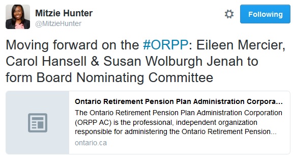 As far as the ORPP, Mitzie Hunter, Ontario’s Associate Minister of Finance, ORPP, Multicultural Minister, tweeted this announcement (click on image):