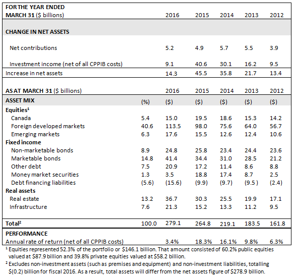 The CPP Fund ended its fiscal year on March 31, 2016 with net assets of $278.9 billion compared to $264.6 billion at the end of fiscal 2015. The $14.3 billion increase in assets for the year consisted of $9.1 billion in net investment income after all CPPIB costs and $5.2 billion in net CPP contributions. The portfolio delivered a gross investment return of 3.7% for fiscal 2016, or 3.4% net of all costs.