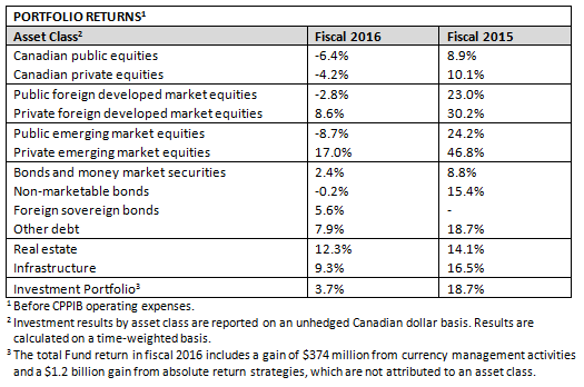 Portfolio performance by asset class is included in the table below. A more detailed breakdown of performance by investment department is included in the CPPIB Annual Report for fiscal 2016, which is available at www.cppib.com.