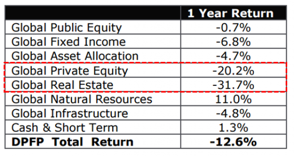 Despite huge exposure to bubbly 2005/2006 vintage real estate investments, DPFP assets “performed” remarkably well throughout the “great recession.” But as it turns out, Tettamant’s “performance” was only as good as the illiquidity of his investments. We guess returns are easier to come by when you invest your whole book in illiquid, private assets and have “discretion” over how they’re valued.