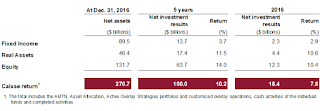 Apart from Bonds, what else did I notice? Very briefly, excellent results in Real Estate, outperforming its benchmark by 320 basis in 2016. Over the last five years, however, Real Estate has slightly underperformed its benchmark by only 40 basis points.