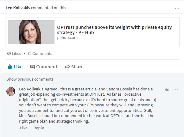 Agreed, Sandra Bosela has done a great job expanding co-investments at OPTrust. As far as “proactive origination”, that gets tricky because a) it’s hard to source great deals and b) you don’t want to compete with your GPs because they will end up seeing you as a competitor and cut you out of co-investment opportunities. Still, Mrs. Bosela should be commended for her work at OPTrust and she has the right game plan and strategic thinking.