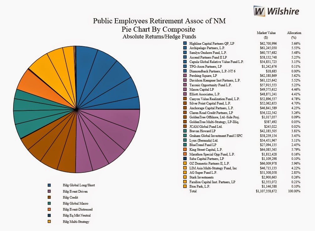 The article above mentions the Public Employees Retirement Association of New Mexico is shifting more of its absolute return program into smaller funds, but when I looked at its latest monthly board meeting packet, I noticed mostly large brand name funds which are well known to most hedge fund investors (from page 33, click on image below):