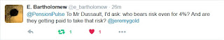 Regarding your questions “who bears risk even for 4%? And are they getting paid to take that risk?” in respect of my proposed financing policy for DB plans. As you know, in most cases the plan sponsor is responsible for amortizing deficits under a DB pension plan. It could well fall partially or totally on the shoulders of plan members. In any event, this deficit-related risk is exhaustive and encompassing, i.e. I do not see the need to include a premium or investment risk within the valuation of liabilities. If both the normal contribution rate and liabilities are calculated on a realistic and long term basis (i.e. avoiding changing the long term term assumptions from one valuation date to another), deficits would normally in the medium and long term be essentially offset by surpluses, provided there are no changes in plan design, no contribution holidays and no avoidance of both surplus and deficit amortization. In that sense, either your second question is not relevant or I do not understand it. Any DB plan is normally sponsored freely by an employers, which involves a business risk for which he/she will be paid for to the extent of how good is that risk.