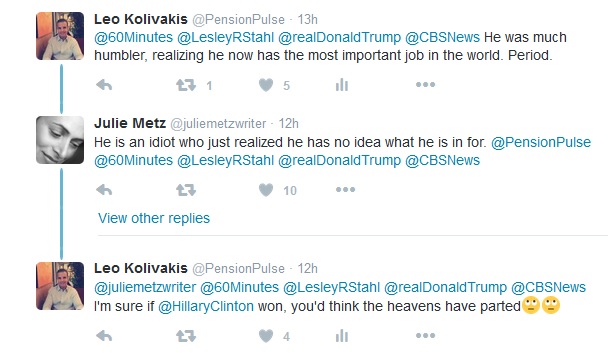 At one point, he and his daughter Ivanka emphasized the needs of the country are far more important than the “Trump brand.” I made the mistake of tweeting my thoughts on the interview and got all these die-hard Hillary Clinton supporters on my case (click on image):